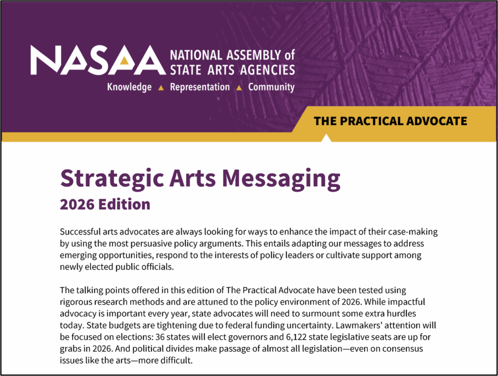 Informed by new research conducted by NASAA in 2025, this edition of NASAA’s Practical Advocate outlines key themes that arts leaders and cultural advocates can use to shape their communications. The talking points are attuned to today’s policy landscape and emphasize messages that resonate with appropriators and elected officials.