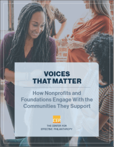 The Center for Effective Philanthropy (CEP) recently released Voices That Matter, which analyzes survey responses from 241 nonprofits and 243 foundations to examine the ways nonprofit organizations collect and integrate feedback from communities they aim to support. The report explores how these practices may have changed over time. Unsurprisingly, the research found the overwhelming majority of organizations collect and use feedback from those they serve at all stages of program provision, that is, before, during or after a program or service has been delivered. 95% of the organizations surveyed collect information from stories of those they serve, 84% administer surveys, 47% conduct focus groups and 45% conduct systematic interviews. These findings echo results from a similar CEP survey 10 years ago. The full report also contains detailed information on the ways nonprofits use feedback and address challenges to feedback collection, including limited capacity and the roles of foundations and funders.
